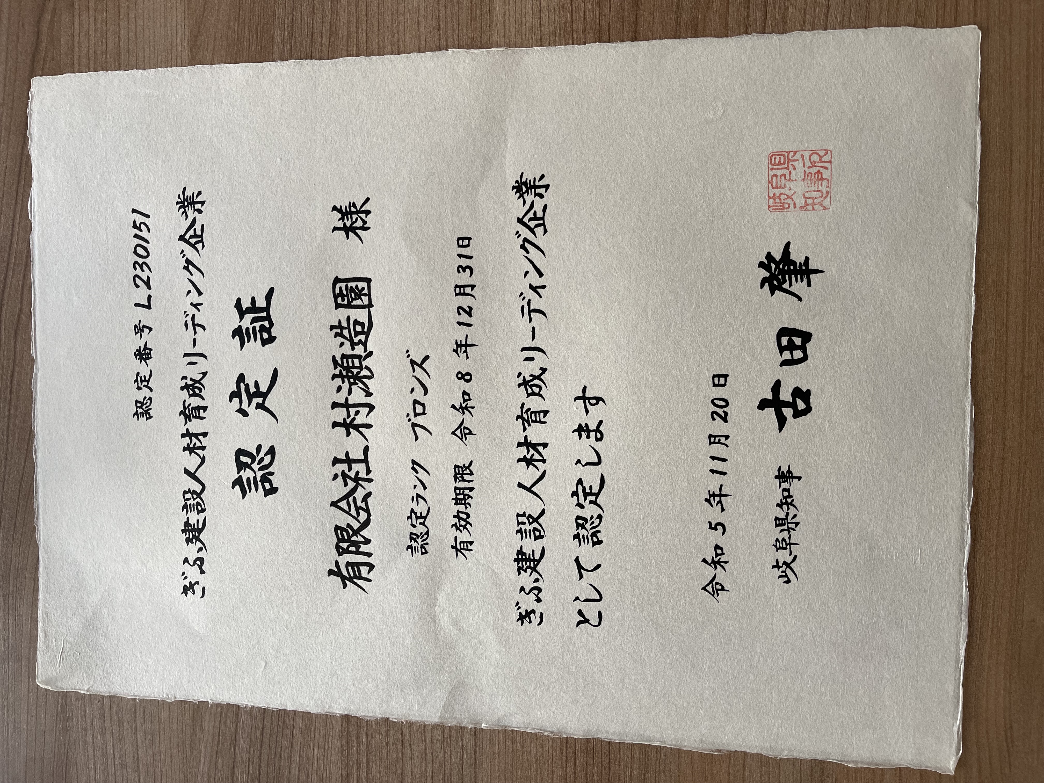 ぎふ建設人材育成リーディング企業のブロンズランクに認定されました!