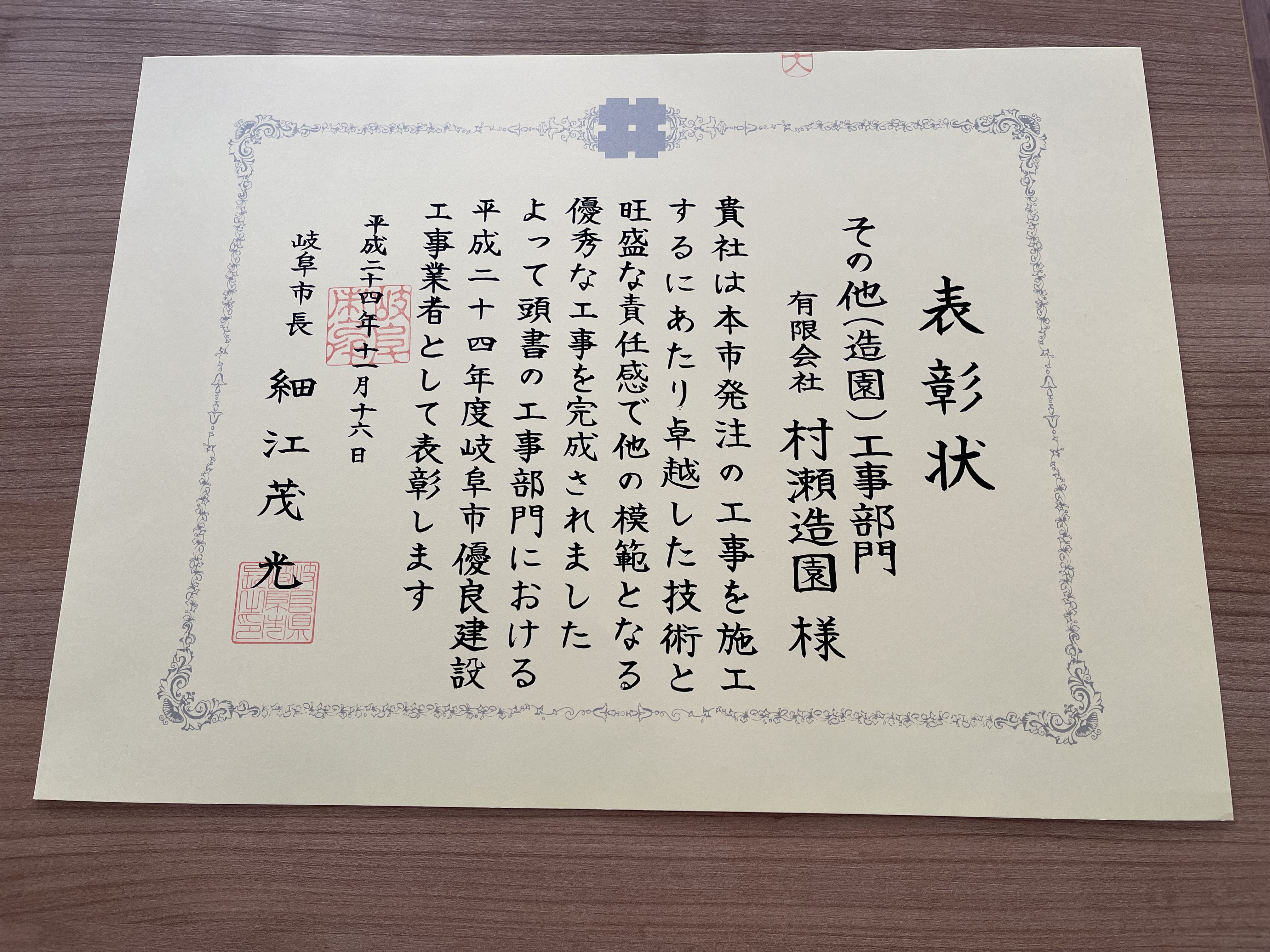 平成24年に造園工事部門で表彰状を授与されました!