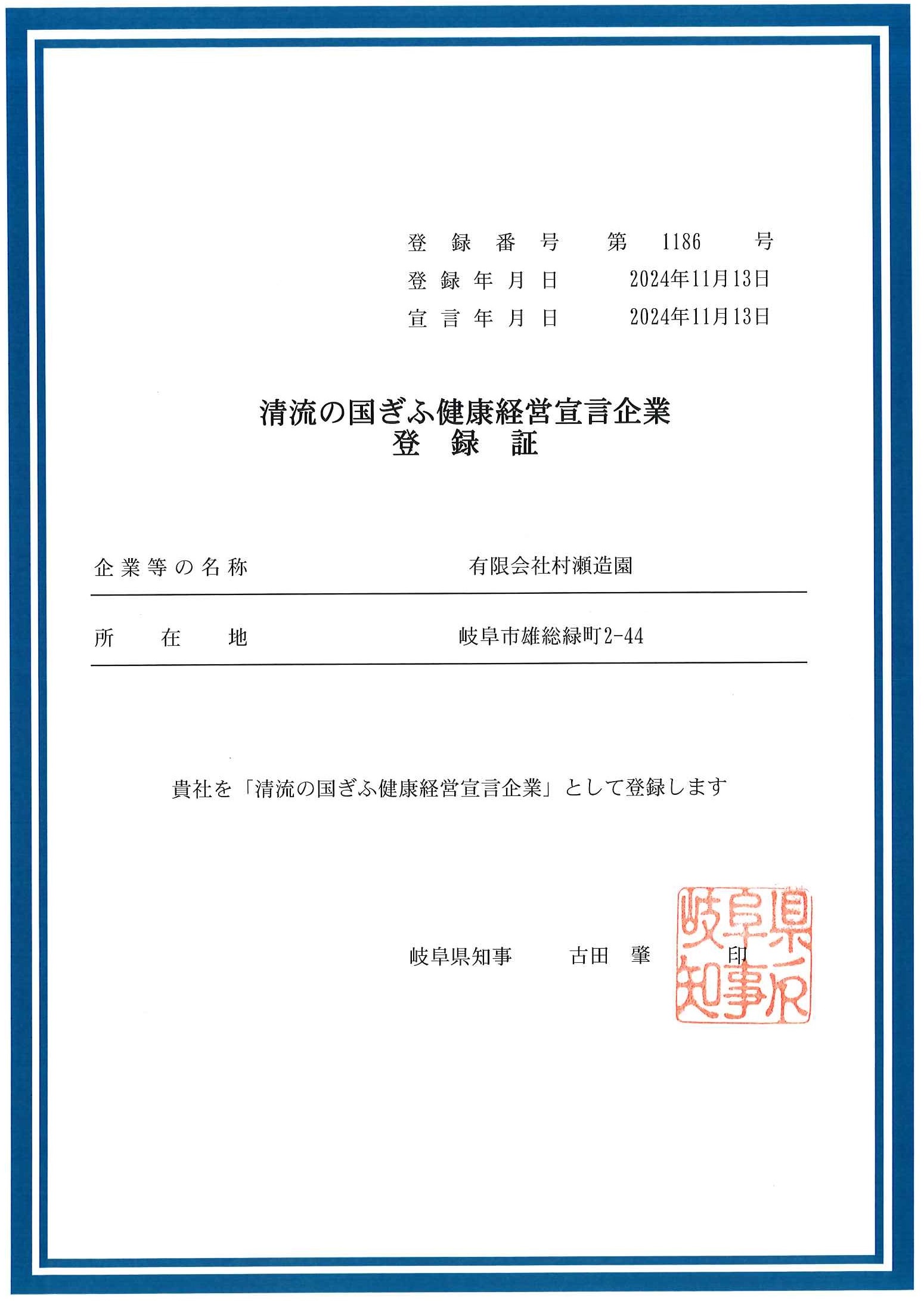 | 昭和59年09月 | 岐阜県知事 許可(般ー59)第11202号 造園業 取得 |